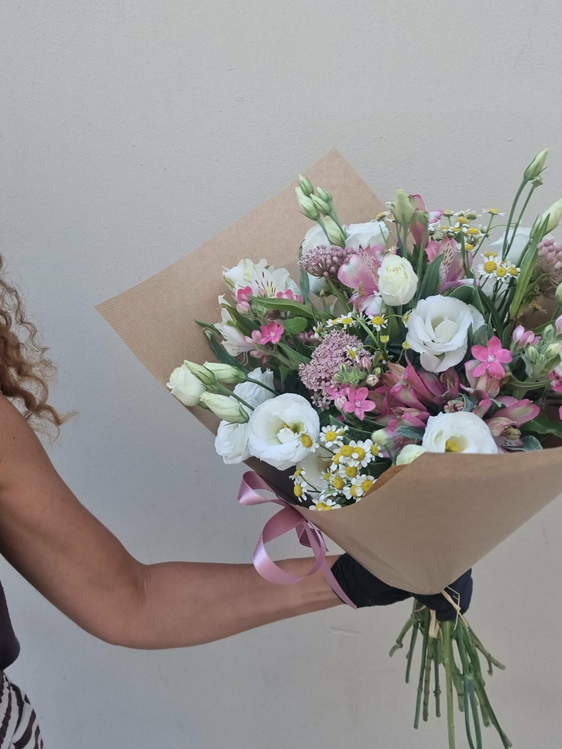 זר רומנטי מלא באהבה , שזור מפרחים שקיימים