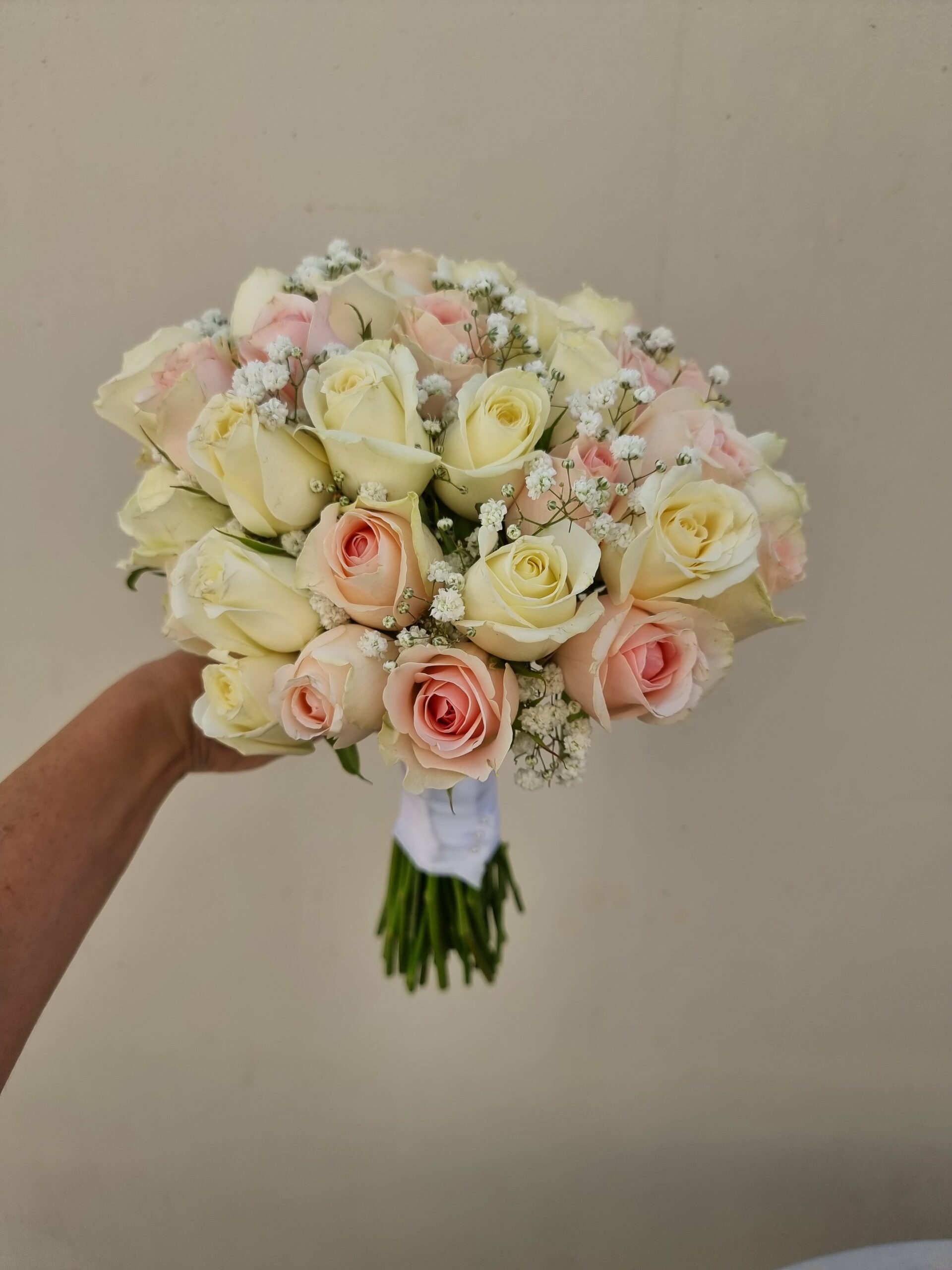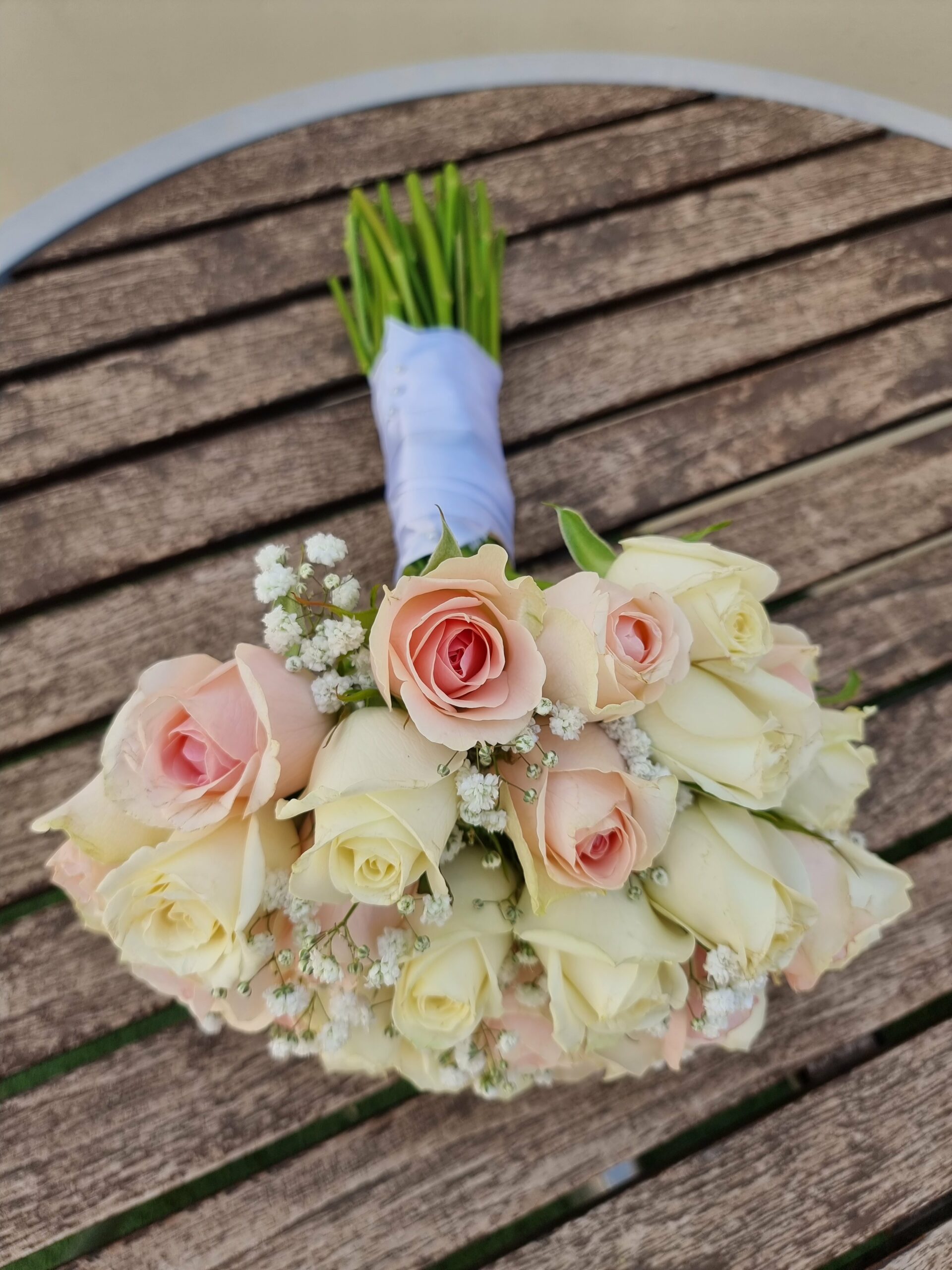 זר כלה בסגנון קלאסי עגול שזור בורדים בשני צבעים.