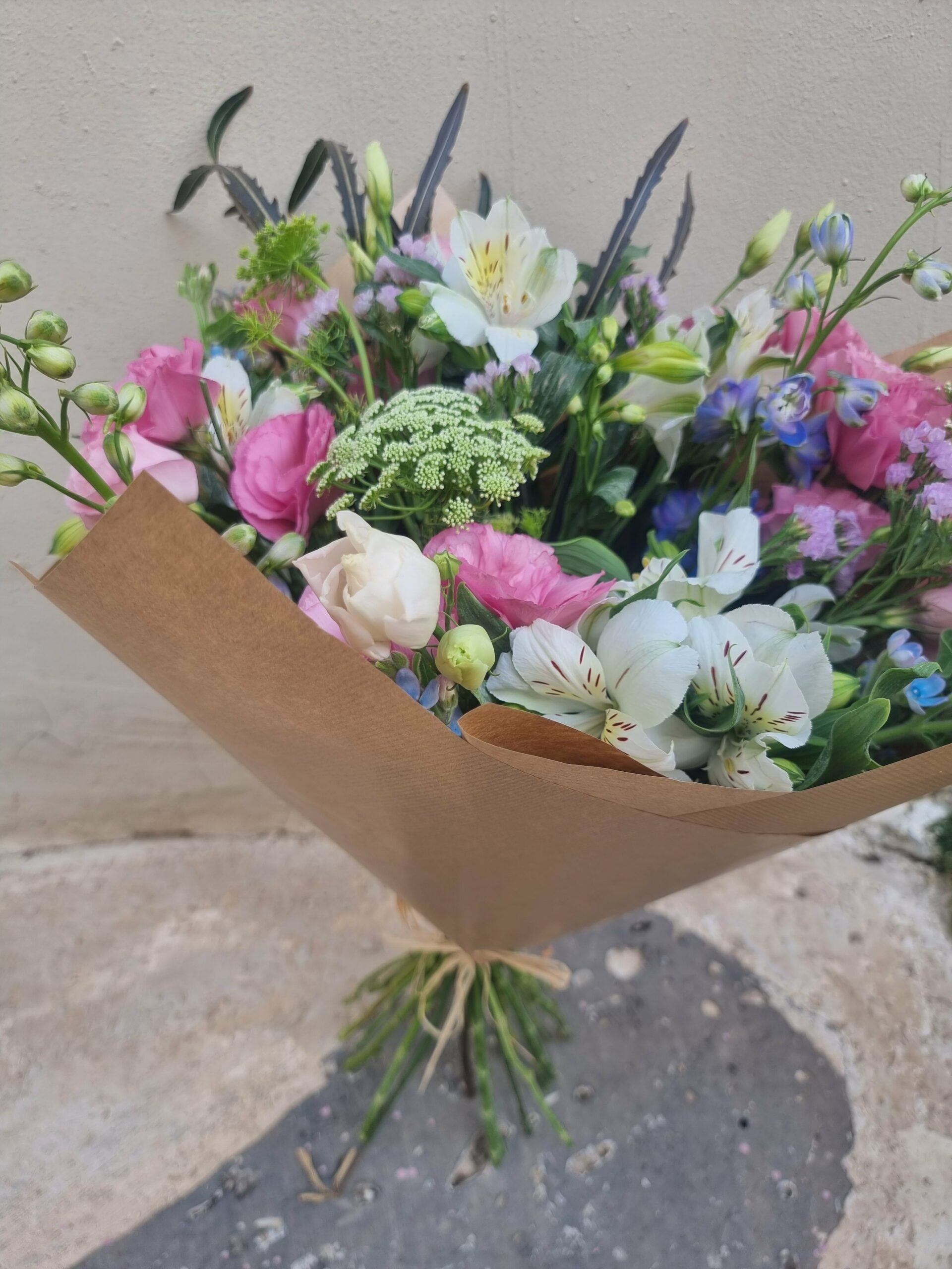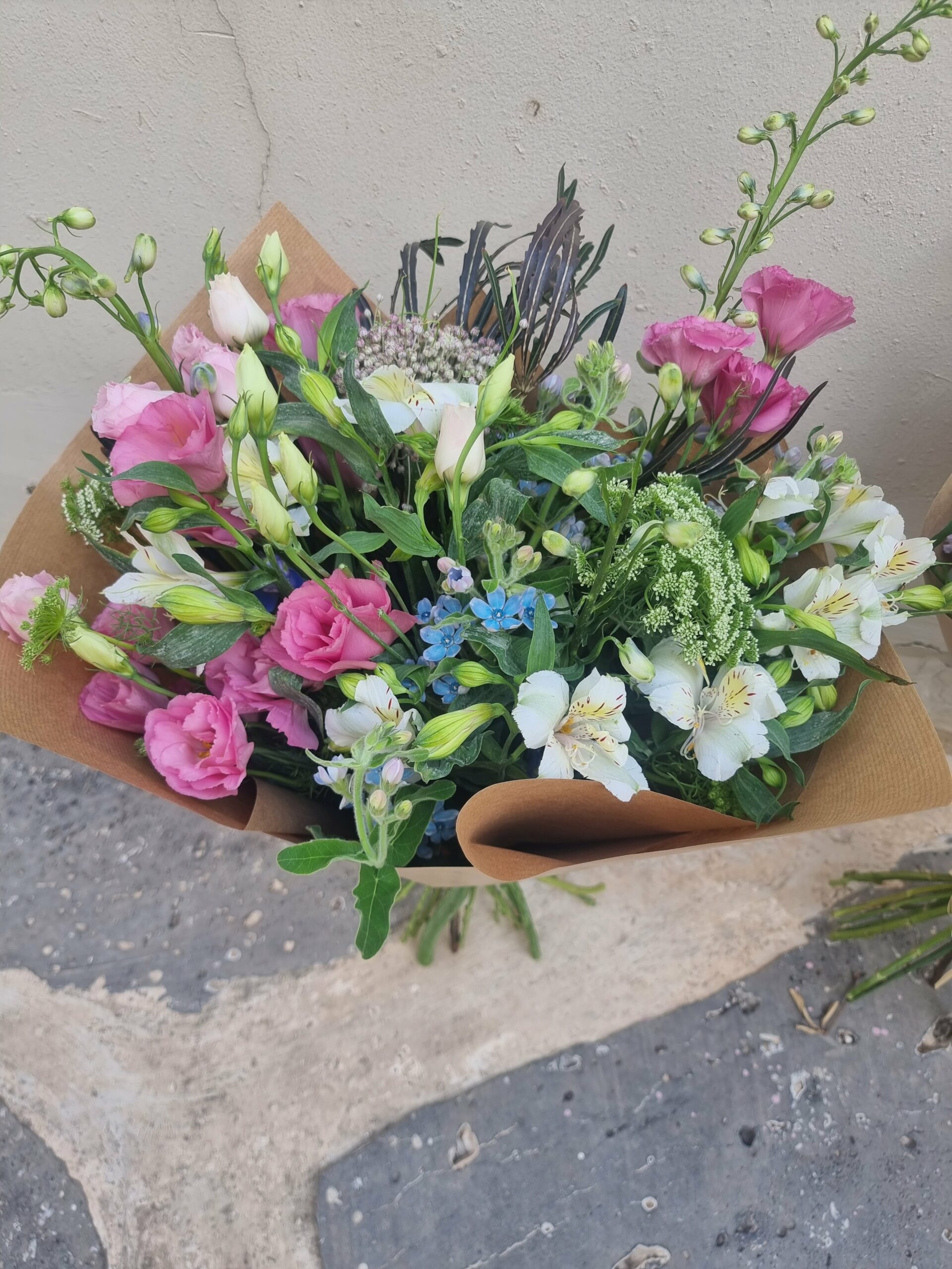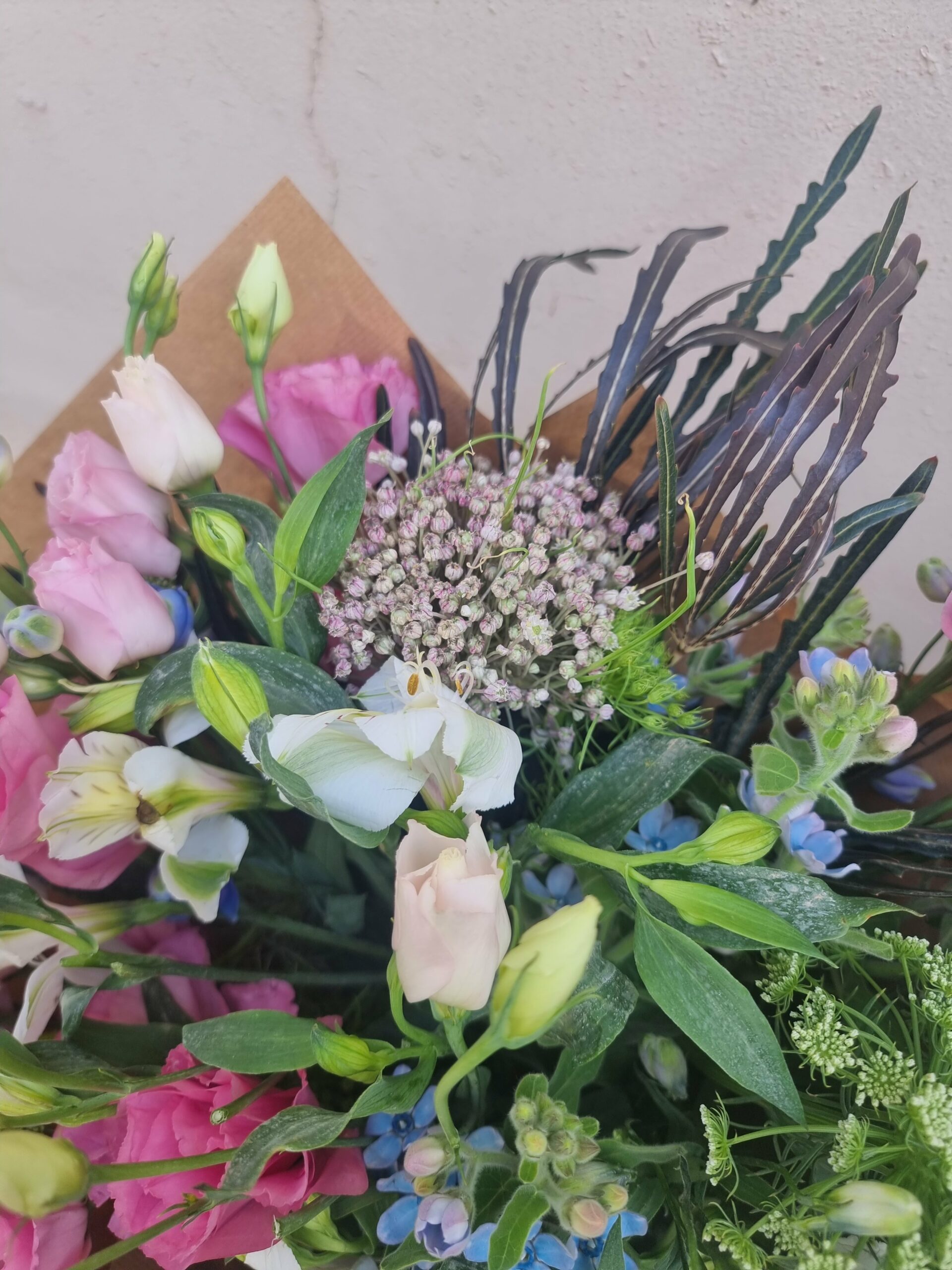 זר בסגנון שזירה חופשי , שזור אלסטרומריה , דולפיניום כחול ,ליזיאנטוס פרח אמיתי , טווידה תכלת ,פרח שום מיוחד עלי ארליה שחורה.